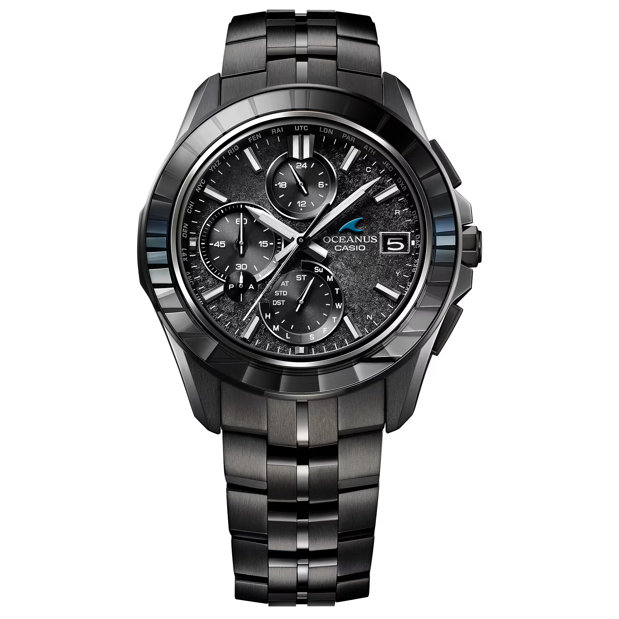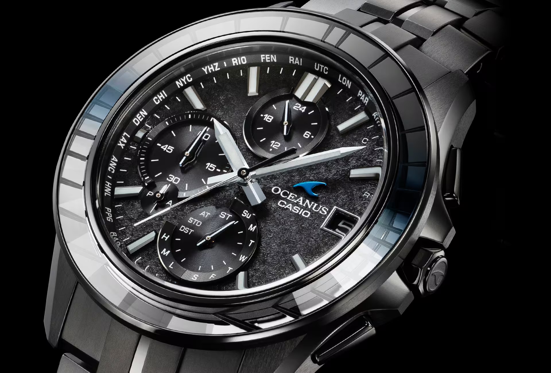 さらに、ベゼル天面の形状にも変化を加え、センターライン(3-9時)を空と海の境界線に見立て、上半分(12時側)をフラット、下半分(6時側)を多面体に仕上げています