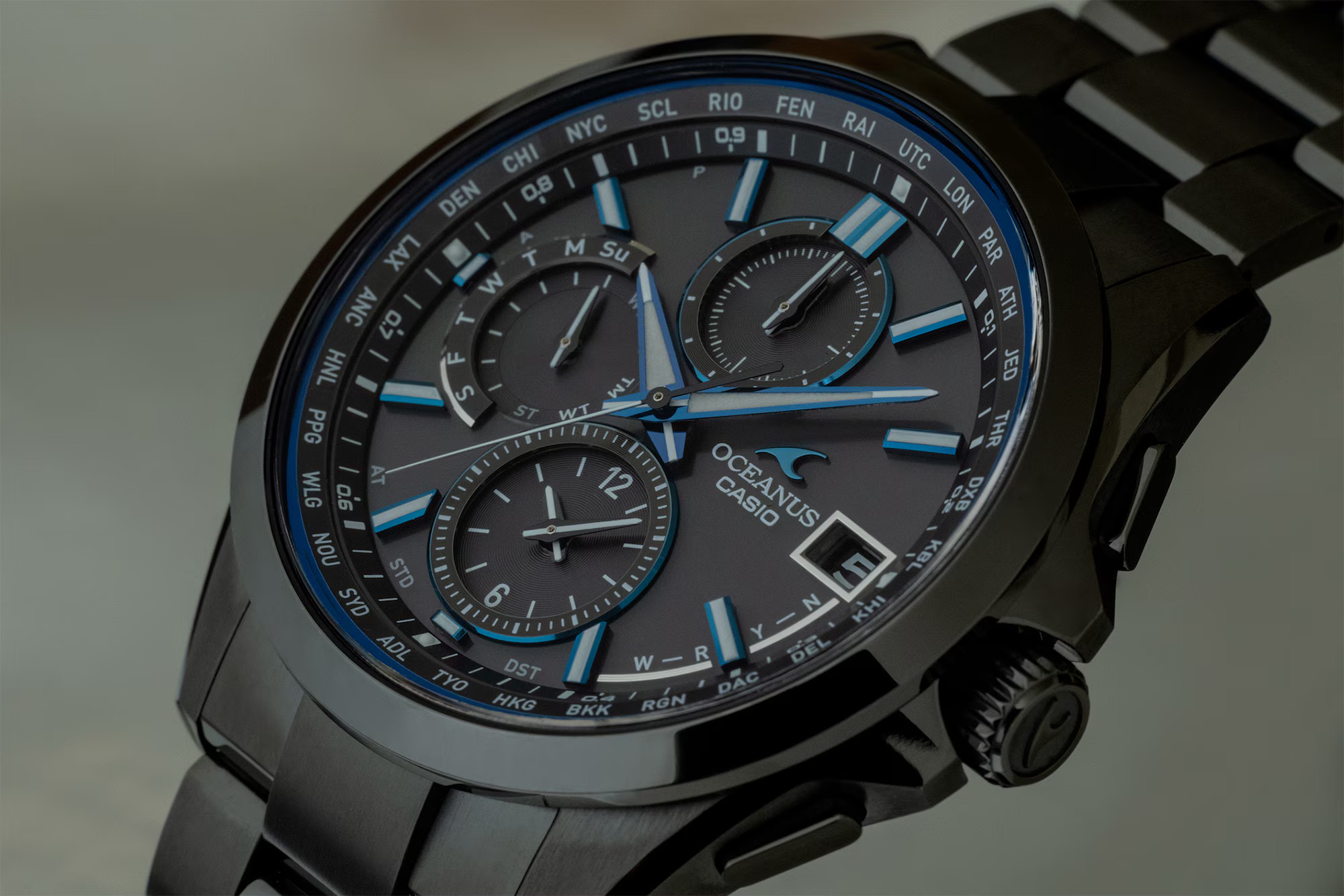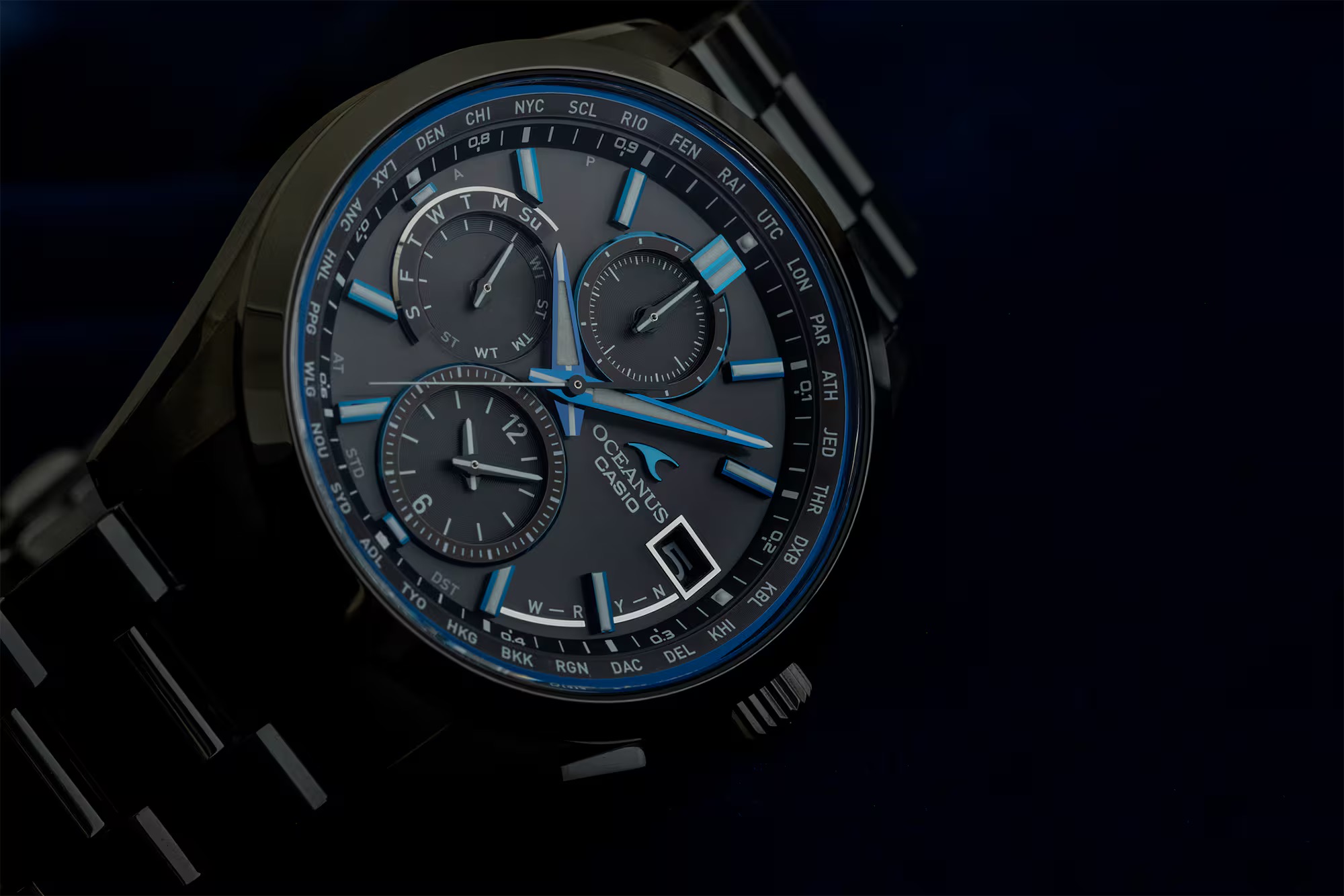 ケース・バンドにDLCコーティングを施し、高い耐摩耗性を実現。全体をブラックに統一することで、OCEANUSのブランドカラーであるブルーを際立たせる仕上げにしました。ワイドフェイスのダイアルは見やすく文字板を2枚重ねることで立体感を演出しています。熟練の技を要するザラツ研磨、チタンカーバイト処理によるケース・バンドの表面硬化など細部に至るまで上質な仕上げを施しました。更にデュアルダイアルワールドタイムを搭載し、ホームタイムとワールドタイムの2都市の時刻を同時に表示可能。超小型6モーターとスマートアクセス搭載で簡単なりゅうず操作によりワールドタイムの都市変更が素早くでき、サマータイムも自動で設定されます。