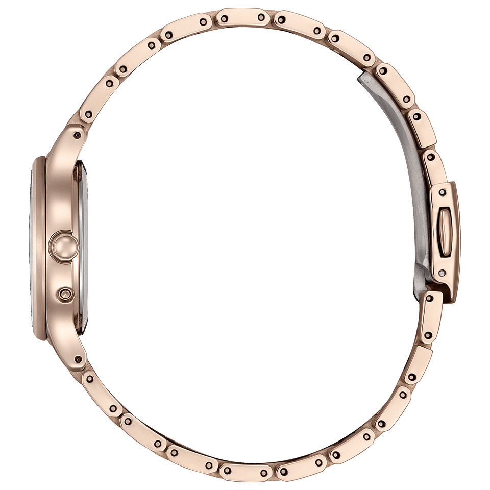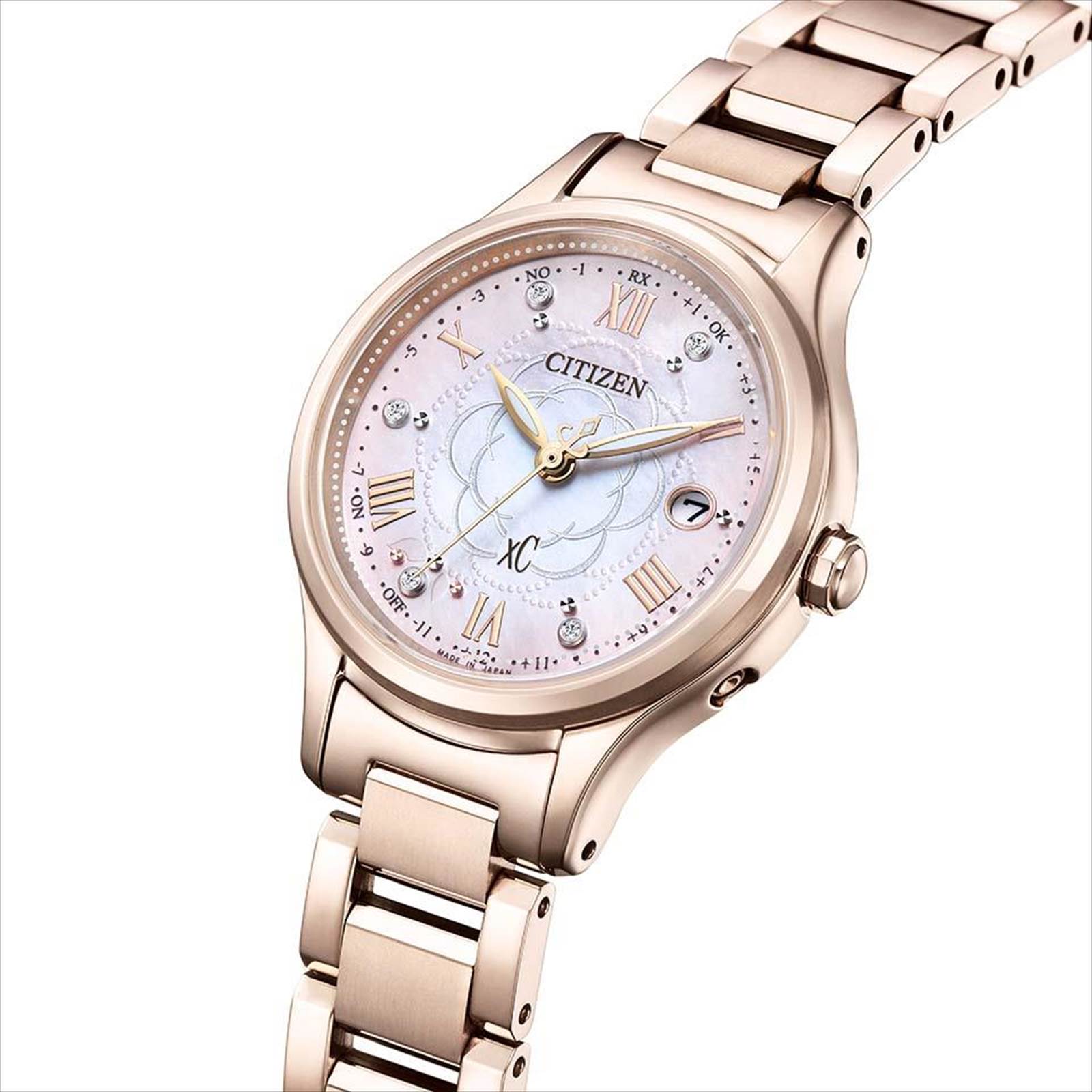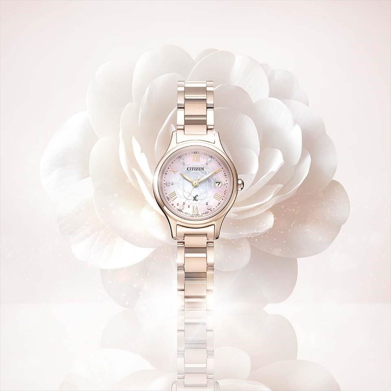 満開の美しいカメリア(椿)をモチーフにデザインした白蝶貝の文字板には、エッチングの花模様と“光の粒”が花びらに乗っているかのようなドットパターンを組み合わせ、愛らしさを表現しています。外周のピンクのグラデーションが、カメリアの華やかさと可愛らしさを引き立てています。