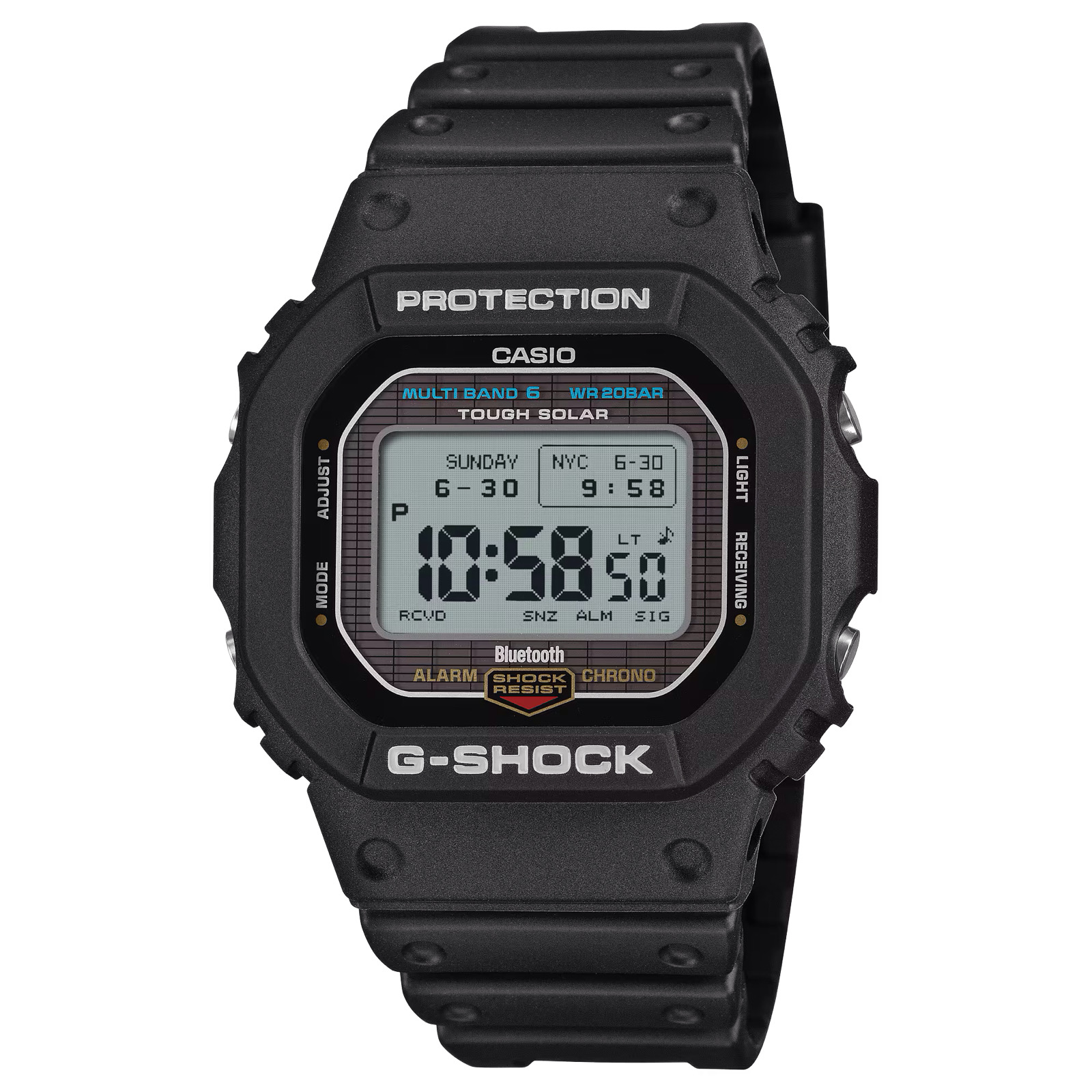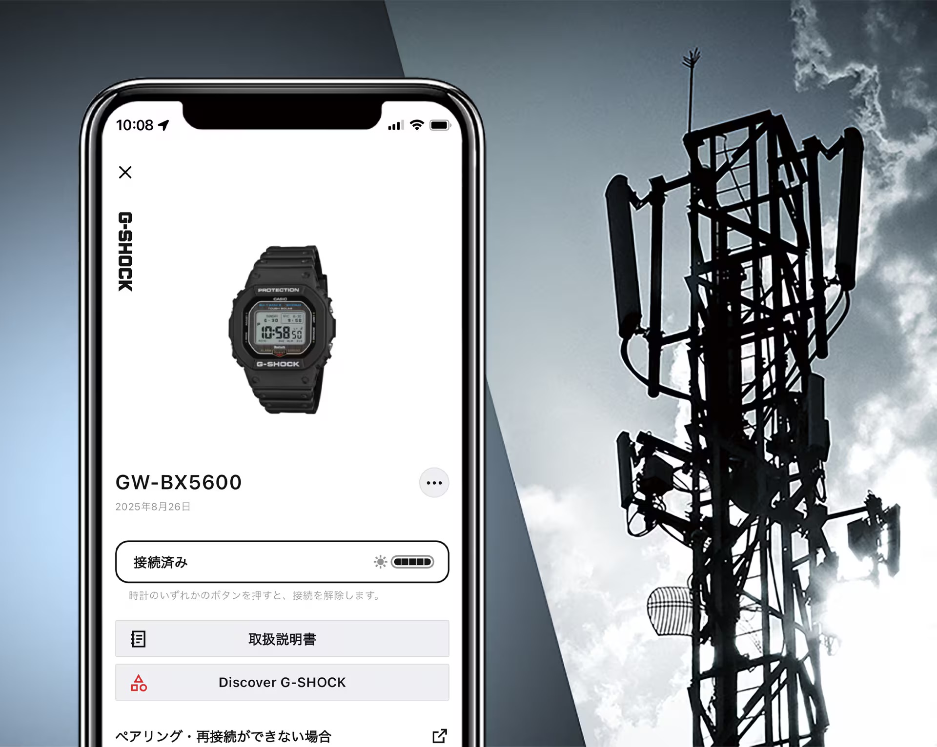 画面変更以外に時刻修正にもモバイルリンクが使用可能ですが、GW-BX5600は標準電波受信機能も搭載しています