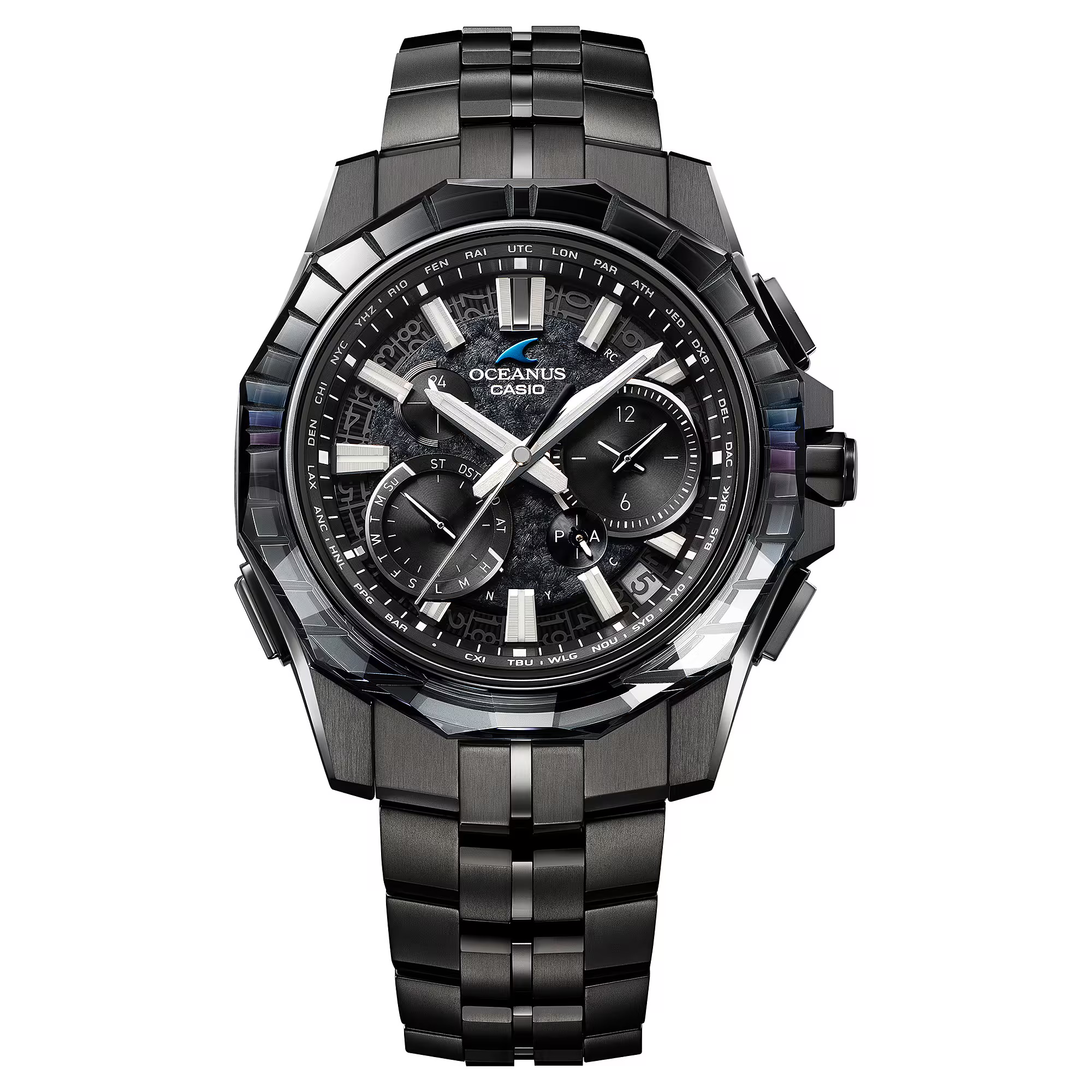 さらに、ベゼル天面の形状にも変化を加え、センターライン(3-9時)を空と海の境界線に見立て、上半分(12時側)をフラット、下半分(6時側)を多面体に仕上げています