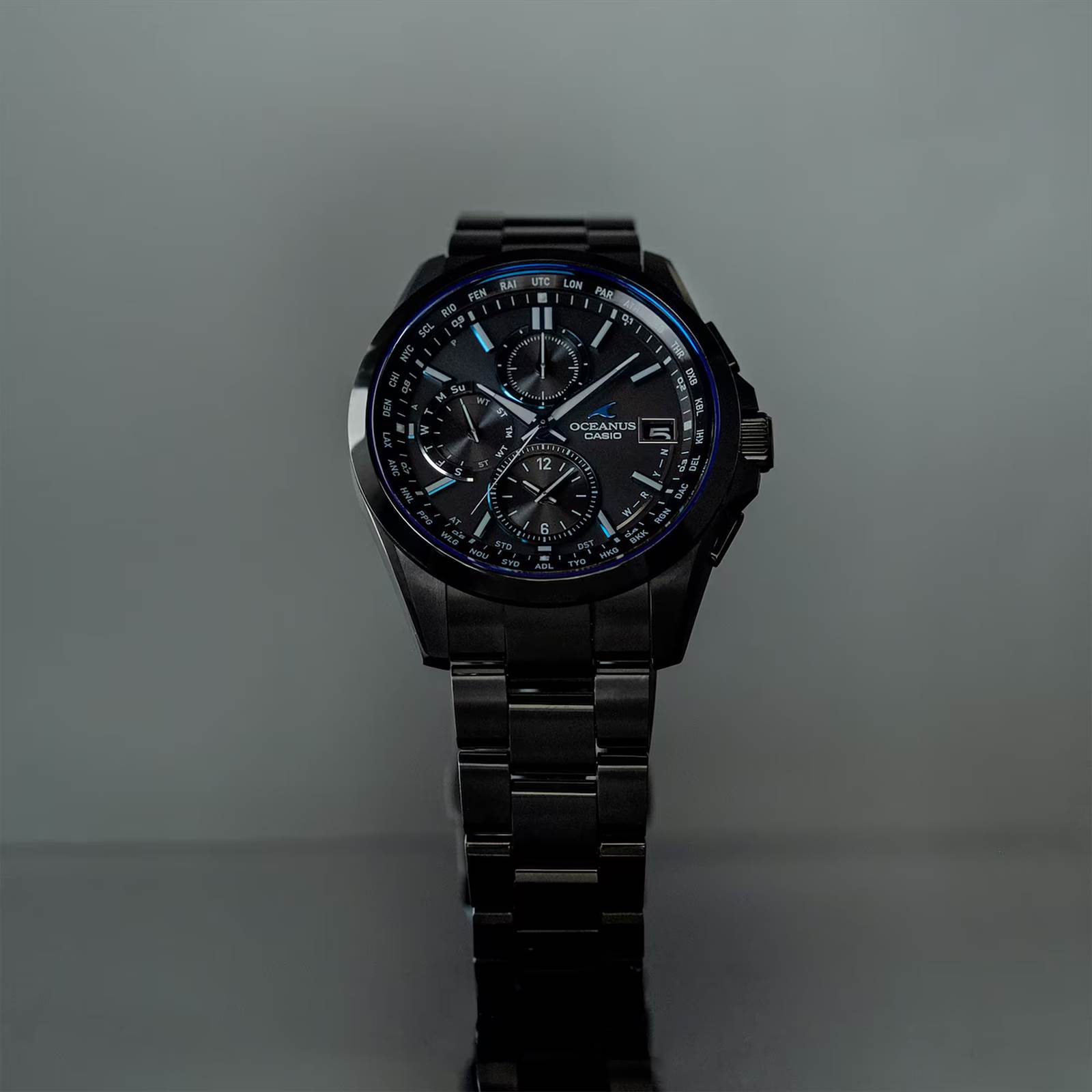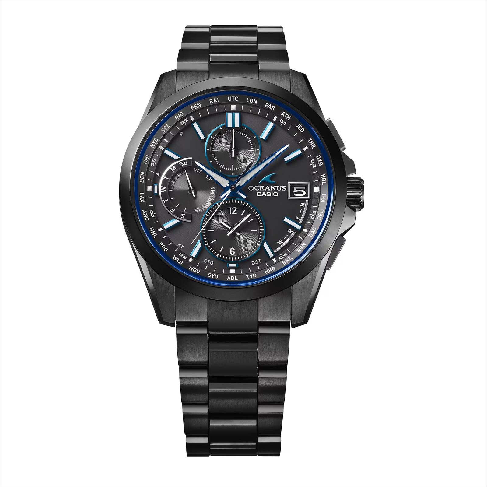 ケース・バンドにDLCコーティングを施し、高い耐摩耗性を実現。全体をブラックに統一することで、OCEANUSのブランドカラーであるブルーを際立たせる仕上げにしました。ワイドフェイスのダイアルは見やすく文字板を2枚重ねることで立体感を演出しています。熟練の技を要するザラツ研磨、チタンカーバイト処理によるケース・バンドの表面硬化など細部に至るまで上質な仕上げを施しました。更にデュアルダイアルワールドタイムを搭載し、ホームタイムとワールドタイムの2都市の時刻を同時に表示可能。超小型6モーターとスマートアクセス搭載で簡単なりゅうず操作によりワールドタイムの都市変更が素早くでき、サマータイムも自動で設定されます。