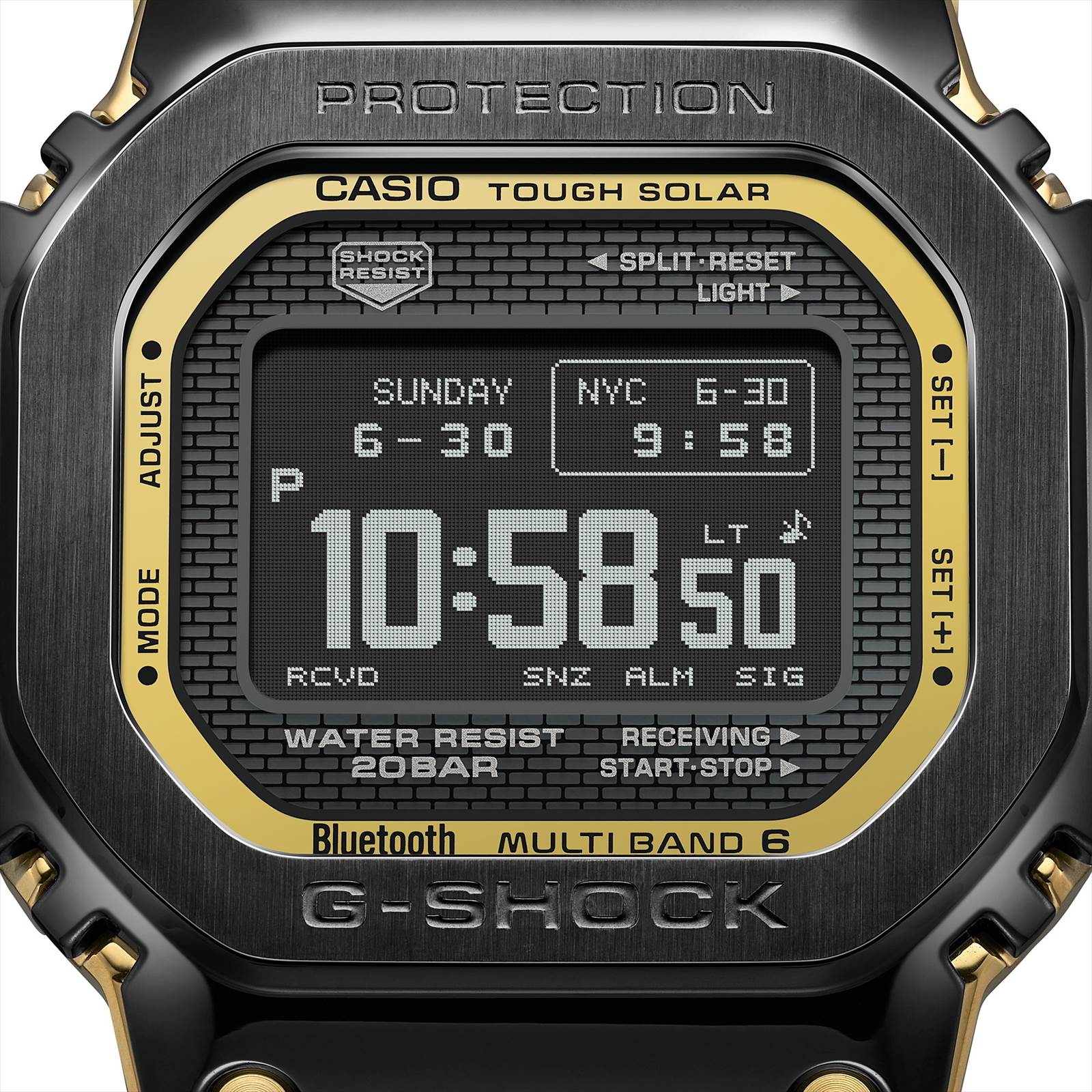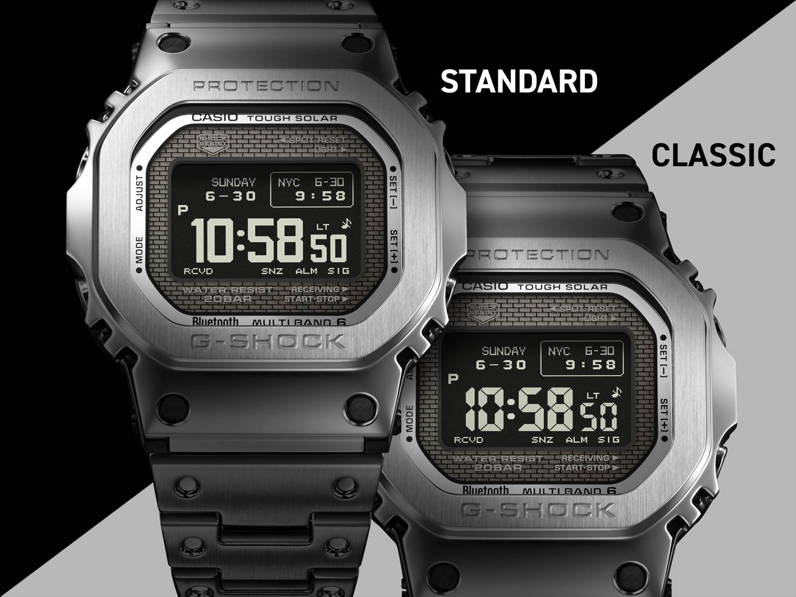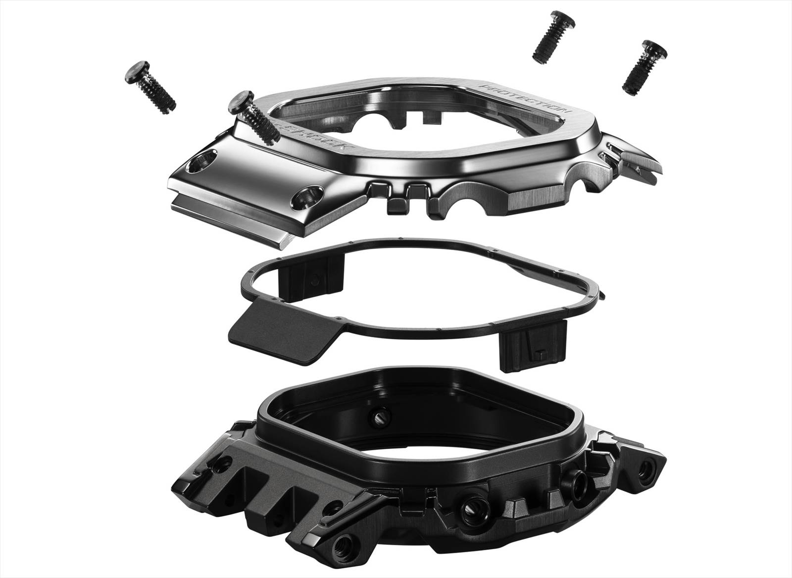 40年以上にわたるG-SHOCKの耐衝撃構造データをもとに、人とAIが共創したジェネレーティブデザインモデルです。 ベゼルとセンターケースを上下で連結した構造を開発。ケースサイドから見える造形が構造の美しさを強調。フルメタルながらG-SHOCKの耐衝撃基準をクリアし、気密性に優れたスクリューバックケースも採用しています。 また、デジタル表示部にMIP液晶を採用。従来液晶に比べきめ細かい描画を可能とし優れた視認性を誇ります。 さらに、4種類の基本時計表示をボタン操作で切り替えられます。 アプリと連携するとメイン表示をクラシカルな7セグメントフォントに切替可能。 機能面ではBluetooth®通信機能により専用アプリと接続し時刻情報を取得。マルチバンド6やタフソーラー等、実用的な機能を備えています。 製造は、初代G-SHOCKを生み出した「山形カシオ」で行われています。