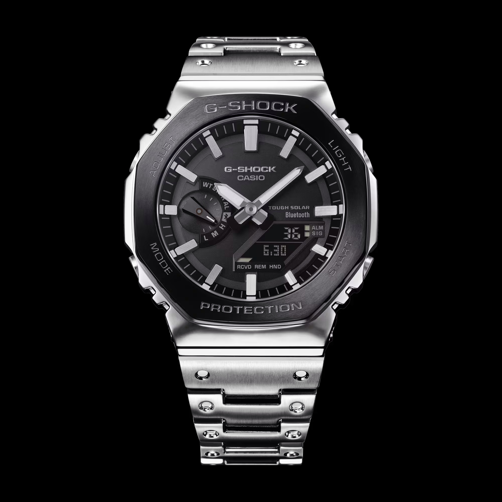 G-SHOCK初代モデル“DW-5000C”の八角形フォルムを受け継ぐGM-B2100です。 シルバーの中に際立つブラックがG-SHOCKの強さを強調しつつ、幅広いスタイルに合わせやすいモノトーンデザインとなっています。 トップベゼルにヘアライン仕上げを採用し、インデックスには視認性を高めるためシルバー蒸着を施しました。 ステンレススチール製のベゼルは鍛造・切削・研磨といった加工を経て立体的に成形。フルメタルによる耐衝撃構造を実現するため、ベゼルとケースの間にはファインレジン性の緩衝材を実装。また、メタル製のバンドピースにはディンプル加工を施し初代モデルの樹脂バンドデザインを継承しています。 初代G-SHOCKを生み出した「山形カシオ」で製造し、気密性に優れたスクリューバックケースも採用しています。